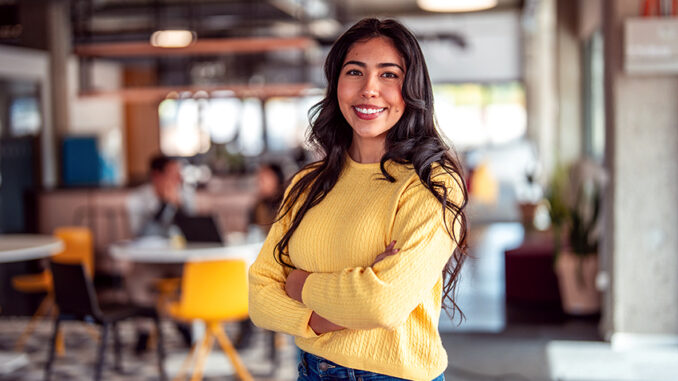 A young adult Hispanic female stands with arms crossed, smiling at the camera, dressed in casual attire within a vibrant coworking office environment.